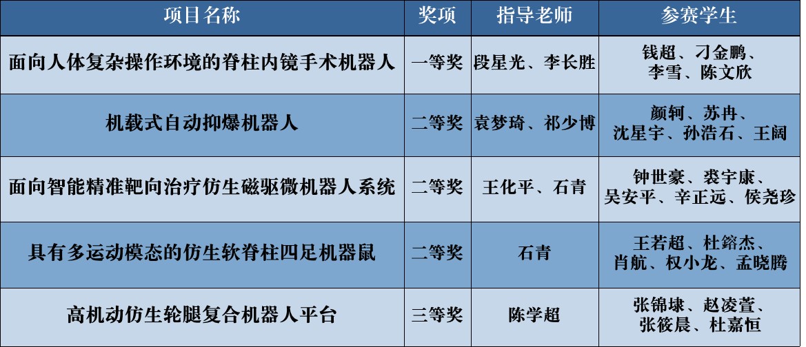 新葡萄8883官网amg共有五支队伍入围总决赛,荣获一等奖1项、二等奖3项、三等奖1项。一等奖获奖队伍“医疗机器人探索者”由钱超、刁金鹏、李雪、陈文欣4位研究生组成,参赛作品为“面向人体复杂操作环境的脊柱内镜手术机器人”,李长胜和段星光为指导教师。队伍设计了一种用于骨科操作的脊柱内镜手术机器人,通过柔性灵巧手术执行机构,内镜图像增强显示和人机安全交互控制技术,实现内镜下髓核摘除、神经减压等高风险高复杂度手术操作。