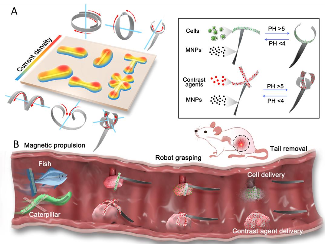 新葡萄8883官网amg智能机器人研究所王化平教授团队在微纳机器人与生物医学工程领域取得重要进展,12月14日,其研究成果“基于可编程非均一电沉积的模块化水凝胶微机器人”(Programmable aniso-electrodeposited modular hydrogel microrobots),以研究长文(Research Article)形式在线发表于科学子刊《科学进展》 (Science Advance)。该成果首创了一种可集成不同功能与形变模块的任意构型单薄膜软体微机器人一体化制造方法,从而解决了微机器人在人体等活体封闭环境下同时开展显影、给药、修复等多序列复杂任务作业的适应性问题,为癌症等重大疾病开发更智能、更集成、更高效的治疗手段提供了新思路。