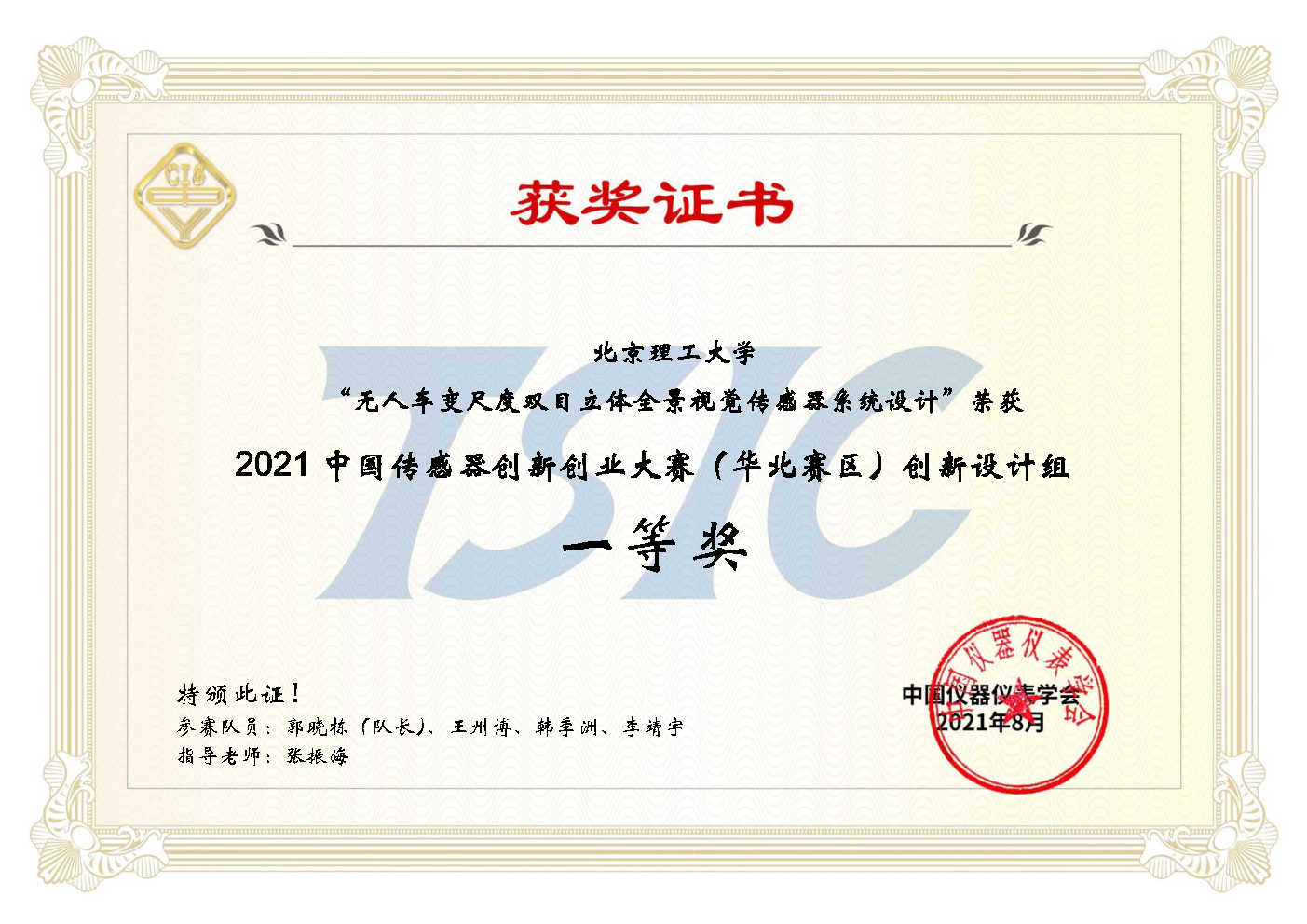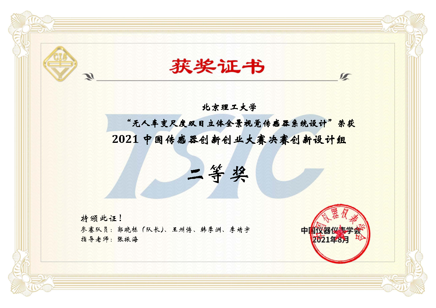 2021年8月19日,第五届中国传感器创新创业大赛决赛落下帷幕,本届传感器大赛共收到自由命题方式的392支参赛作品,分别来自全国八个赛区(东北赛区、华北赛区、华中赛区、华东赛区、东南赛区、华南赛区、西南赛区、西北赛区),大赛采用赛区预赛与全国决赛相结合的形式。赛区预赛于2021年7月16日-7月20日举行,根据大赛专家委员会制定的评审标准,经各赛区知名传感器专家评审,392支参赛作品共评选出61支优秀作品进入全国总决赛,决赛分“创新设想类”、“创新设计类”和“创新应用类”三组独立答辩评审。参赛队伍利用PPT、视频、实物样机等多种方式对自己的作品进行了精彩展示,评审专家从学术、技术和应用前景等角度对参赛作品提出建议、公平公正地进行评判。通过角逐,决赛共评出特等奖2项、一等奖4项、二等奖23项、三等奖32项。我校新葡萄8883官网amg张振海副教授指导的北理工大黄蜂队(学生:郭晓栋,王州博,韩季洲,李靖宇)参赛作品“无人车变尺度双目立体全景视觉传感器系统设计”取得2021中国传感器创新创业大赛决赛二等奖、2021中国传感器创新创业大赛(华北赛区)一等奖的好成绩。