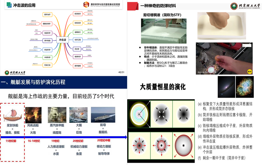 随后,中科院力学所王柏懿研究员做了题为“献身科学,追求真理——学习老一辈科学大家的精神与风范”的报告。报告以自己青年时代的学习经历为主线,结合中国力学事业发展历史,与大家分享了钱学森先生实事求是,严格认真的治学态度;郭永怀先生以身许国,甘做祖国铺路石的奉献精神;俞鸿儒先生数十年如一日,一生只做一件事的踏实作风。实验室袁梦琦教授做了题为“钢铁侠是怎样炼成的”报告。报告以防护服的历史发展为脉络,详细地讲述了防护服从古至今的发展变化,以及防刺服、防弹服、防爆服的防护原理。实验室谢晶副教授、张宏副教授、李营副教授和李健博士通过线上的方式分别做了题为《冲击波在生命科学中的应用》、《子弹的真实杀伤力与防护手段》、《大型水面舰艇是如何抗爆的》和《超新星爆炸、中子星与黄金起源》的报告。这些报告主题鲜明、图文并茂、生动有趣,公众与专业教师进行了线上线下的交流互动,感受到了爆炸科学的无限魅力,了解到了爆炸相关的前沿科技,学到了书本之外的爆炸知识, 受益匪浅。
