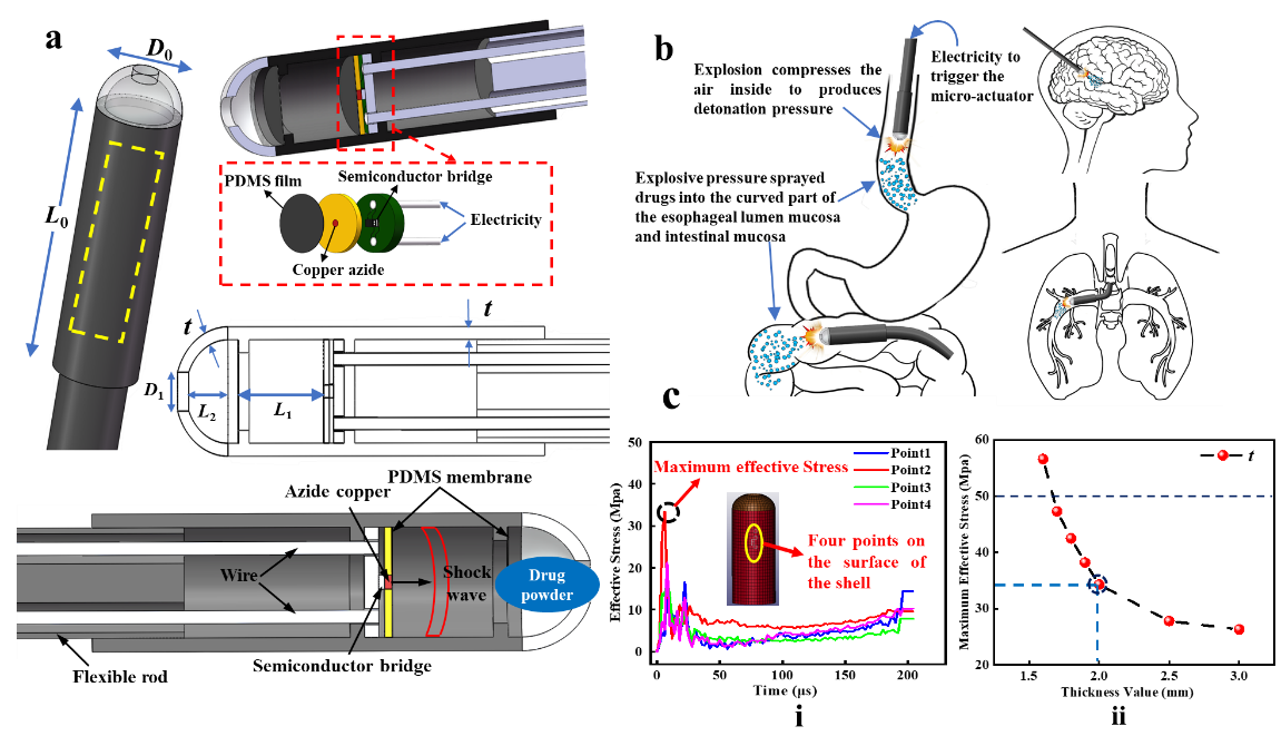 基于此,娄文忠教授团队提出一种基于微区爆炸冲击喷射靶向药物输送微系统,外径毫米级,尾部一根柔性杆可将靶向药物深入体内难触及区域,激发纳米级原位装药,将靶向药物精准喷射到体内病灶区域,靶向药物可获得动能为3.2×10-4J,通过系统结构优化设计,使冲击波主要沿轴向传播,大幅抑制径向振动,其内纳米级PDMS薄膜,可将爆炸产生铜化合物拦截在管壳内。微系统作用时间百微秒级,不会有温度变化(图2)。