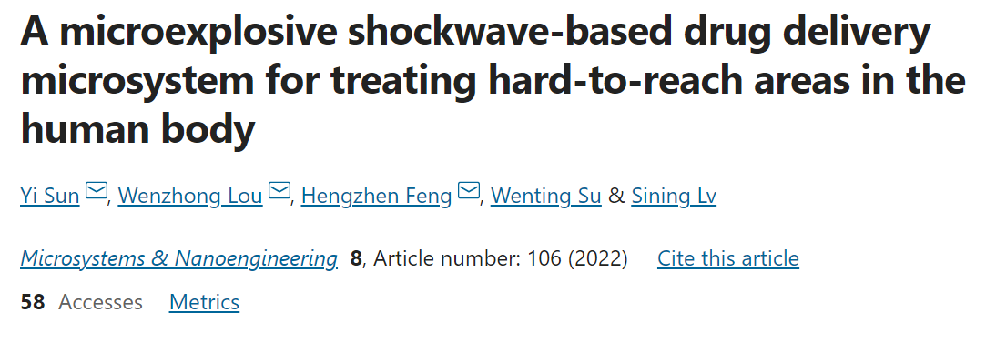 近日,Nature旗下国际顶级期刊Microsystems & Nanoengineering(影响因子8.006)发表了新葡萄8883官网amg娄文忠教授课题组在体内难触及区域靶向治疗及止血消杀微系统应用方面的重要研究进展,相关成果以“A microexplosive shockwave-based drug delivery microsystem for treating hard-to-reach areas in the human body” 为题发表。该工作的第一作者为新葡萄8883官网amg博士研究生孙毅,通讯作者为新葡萄8883官网amg娄文忠教授和冯恒振博士后,新葡萄8883官网amg为论文的第一单位。
