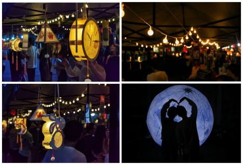 “‘听见了也看见了’,打一成语,这个谜底是什么呢?”,“我觉得应该是‘耳闻目睹’吧!”。“‘朝来川水雨连绵’打一地名,这个谜底又是什么呢?”一位身着汉服的同学自语道,“应该是潮州吧!”,猜谜底的交谈声此起彼伏。傍晚秋风习习,一轮“圆月”悬挂在三号教学楼前,熙熙攘攘的人群穿梭在花灯和谜面组成的海洋里,一场中秋游园盛会正在这里隆重呈现。