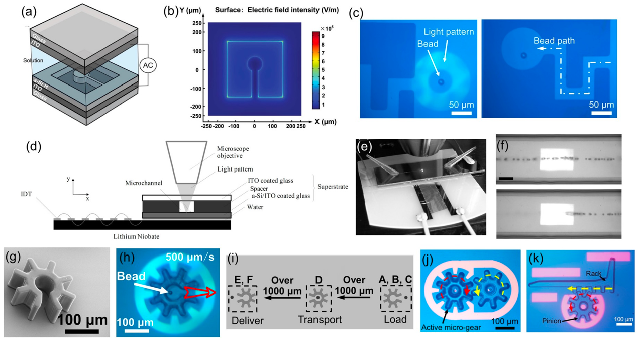 光电镊技术还可以与其他微流控技术结合使用,例如流道式微流控、数字微流控和光电润湿技术等。将光电镊技术与微流控技术集成在一个系统后,即可控制微流控装置不断地将样品输送到光电镊工作的区域(图6),实现基于光电镊技术的高通量目标分选、分离和处理。同时,光电镊技术也常与其他微操作技术集成使用,例如传统介电泳技术、声学镊子、微纳米机器人等(图7),这种集成提升了光电镊技术对微小目标的操控灵活度,拓展了光电镊技术的应用领域。
