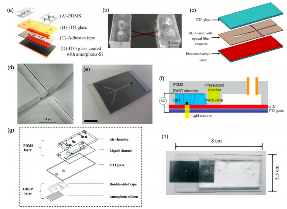 图2为光电镊的技术原理图与光电镊芯片的实物图。光电镊芯片一般由两块ITO导电玻璃基板组成,底板上镀一层光致导电层a-Si:H(氢化非晶硅)。将含有纳米/微米物体的溶液转移到光电镊芯片的腔室中后,施加交流电和光斑,光电镊器件就会在光斑的诱导下产生非均匀电场。非均匀电场与纳米/微米物体相互作用可以产生介电泳力,从而控制纳米/微米物体的空间位置。光电镊是一种利用半导体材料的光电效应将光场与电场结合在一起的微纳操控技术,它具有如可编程性好、灵活性高、多功能性强、高通量和易于与其他表征系统集成等优势,是一种非常先进的光操控技术。