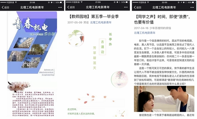 新葡萄8883官网amg团委依托“机电新青年”微信公众号开展思想引领。先后推出“青春榜样”系列文章,分享优秀学子成长成才经历,让团员青年时刻接受思想信仰教育,学习榜样,坚定信仰;坚持每月推送教师园地系列文章,拓宽了新葡萄8883官网amg师生之间相互了解、平等交流的渠道,彰显青年教师思想风貌,展现青春风采、倡导人文情怀、把握时代脉搏,引领青年团员健康的思想动向;每月一期“青春机电”电子刊物以新颖的形式,按月对学院动态进行跟踪、报导和总结,记录新葡萄8883官网amg各大新闻,彰显青春风貌,服务全院师生,积极宣扬健康、向上、和谐的校园生活。