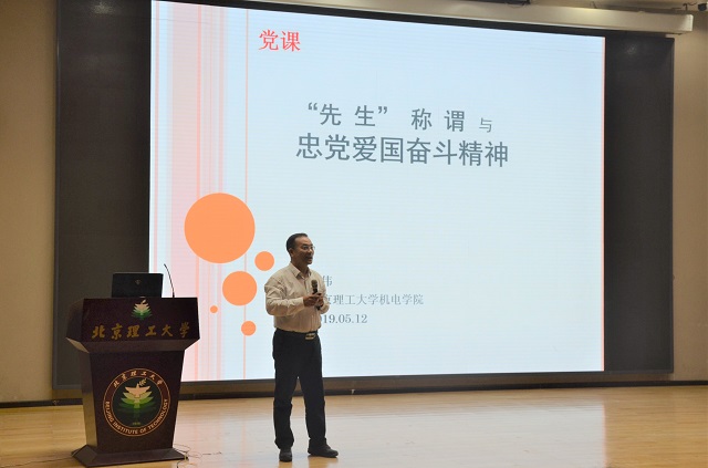 随后王伟以“‘先生’称谓与忠党爱国奋斗精神”为主题为同学们作专题党课。王伟首先对学生骨干提出“服务同学、提升自己”的目标,并告诫毕业生党员时刻牢记党员身份,不忘初心,努力奋斗,为党旗添彩,为母校争光。之后王伟从“先生”的类别演化、属性两方面概括出当代“先生”的内涵,同时通过钱学森的事例告诉同学们做合格党员不仅需要知识丰富、品德高尚、自立自强,更需要忠党爱国。最后王伟希望同学们能坚持自省、奋发向上,继承这一份修为、一种精神,在若干年后被称为“先生”。